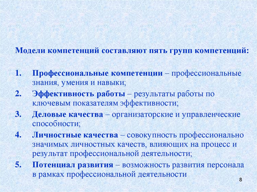Модели компетенций составляют пять групп компетенций:1.