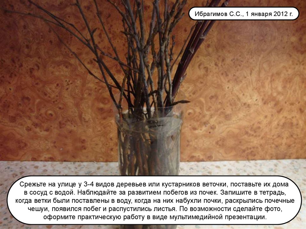Ибрагимов С.С., 1 января 2012 г.Срежьте на улице у 3-4 видов деревьев или кустарников веточки, поставьте их дома