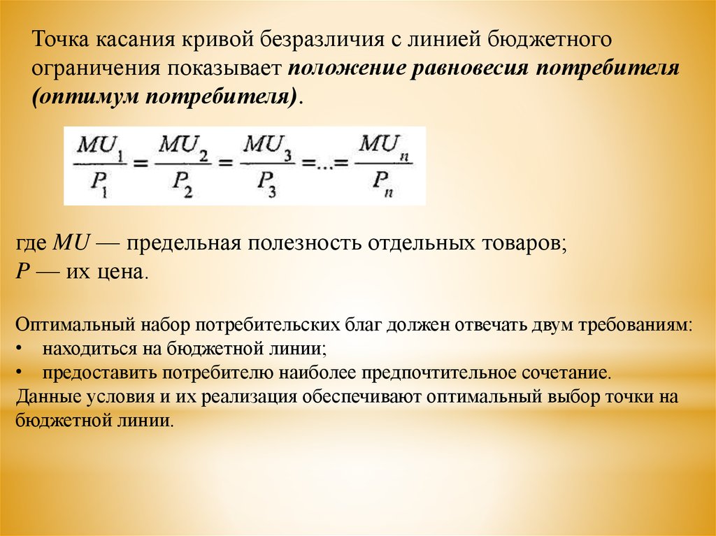 Оптимальный набор потребительских благ должен отвечать двум требованиям: