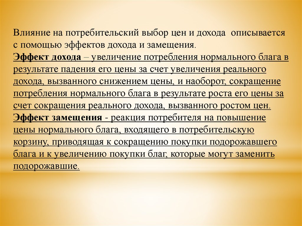 Влияние на потребительский выбор цен и дохода описываетсяс помощью эффектов дохода и замещения.