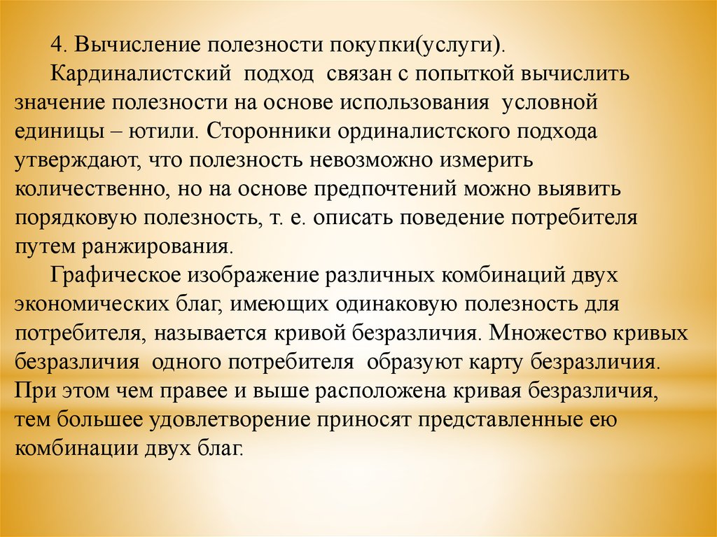 4. Вычисление полезности покупки(услуги).Кардиналистский подход связан с попыткой вычислить