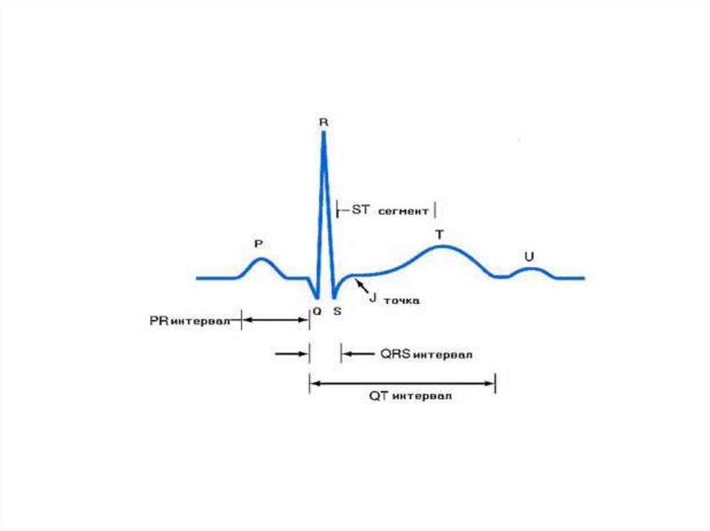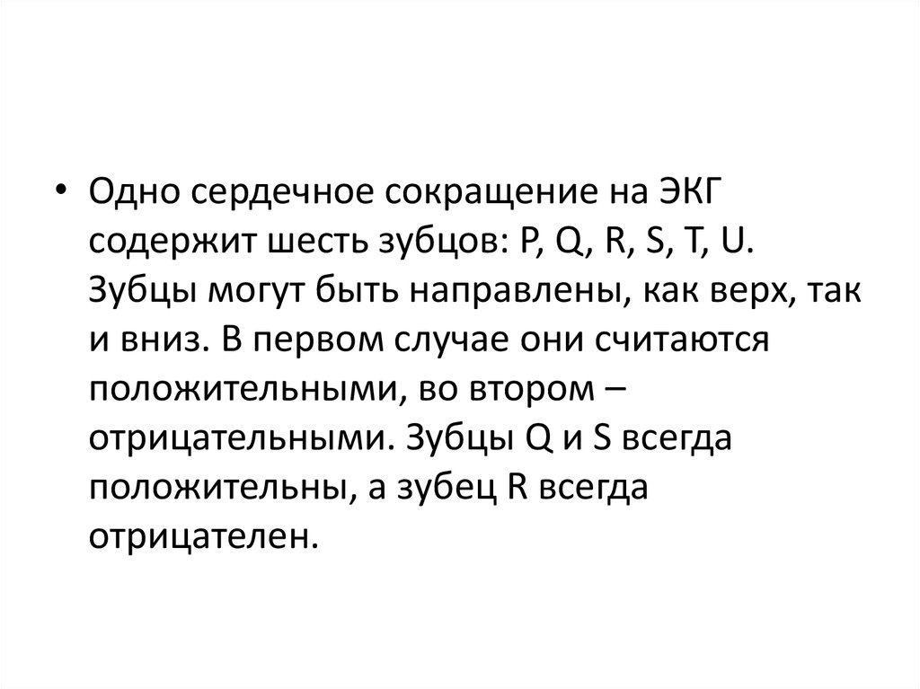 • Одно сердечное сокращение на ЭКГсодержит шесть зубцов: P, Q, R, S, T, U.