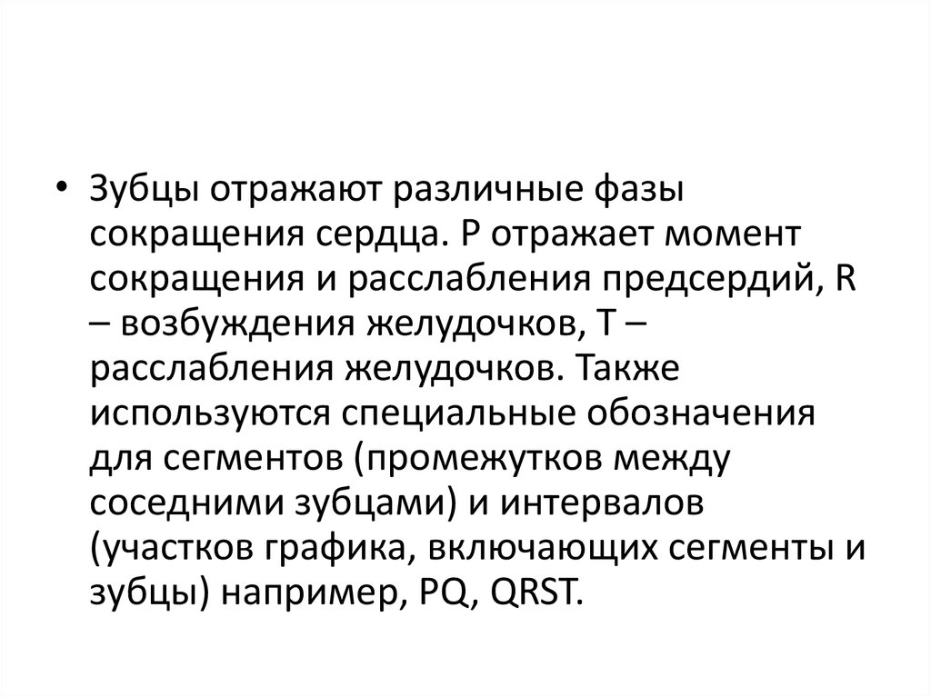 зубцы) например, PQ, QRST.