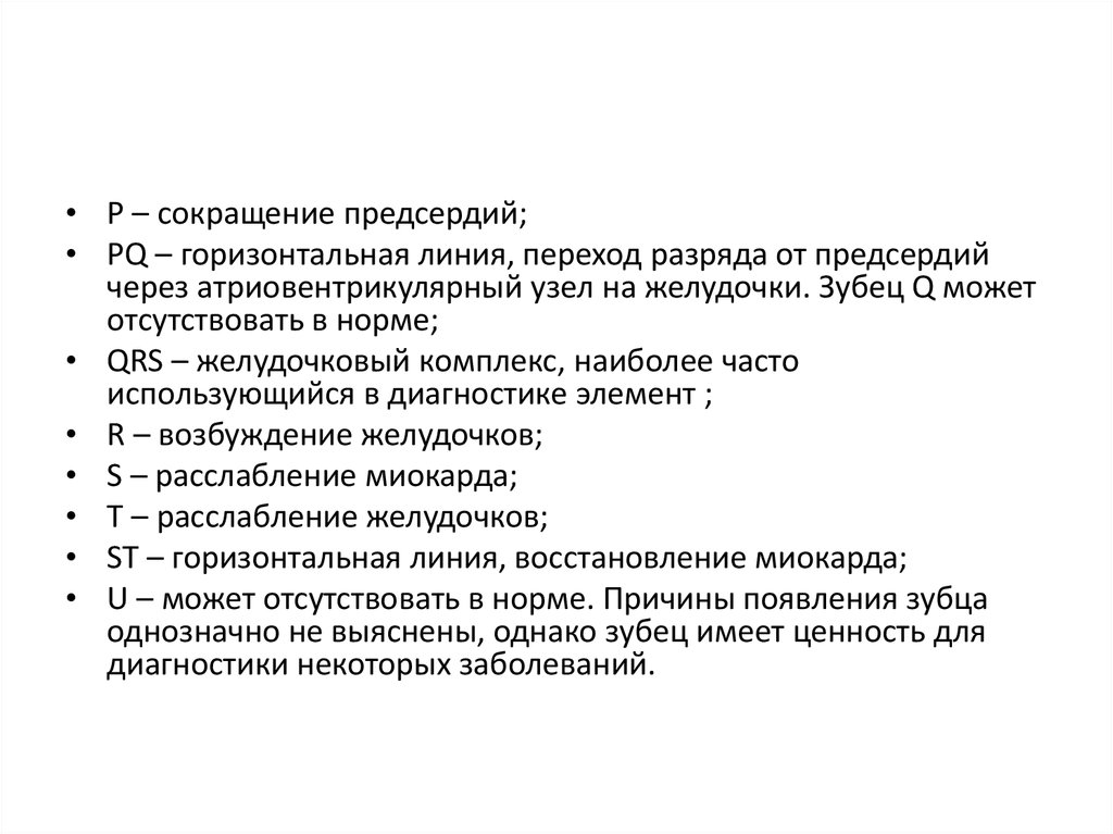 • P – сокращение предсердий;• PQ – горизонтальная линия, переход разряда от предсердий