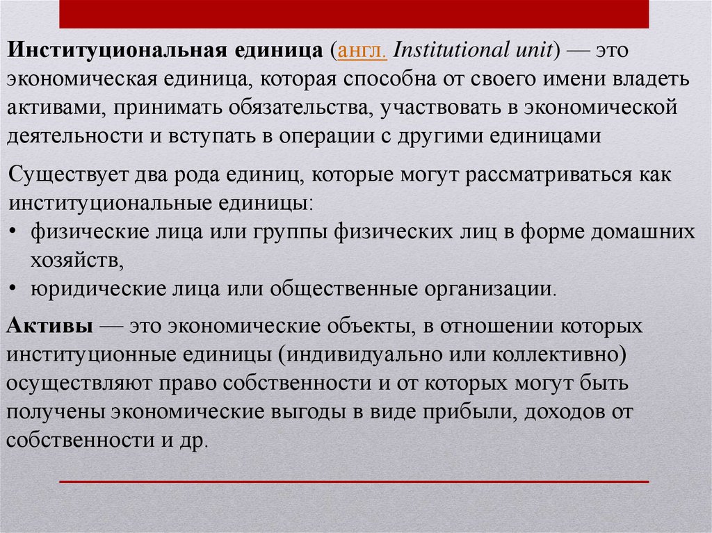 Институциональная единица (англ. Institutional unit) — этоэкономическая единица, которая способна от своего имени владеть