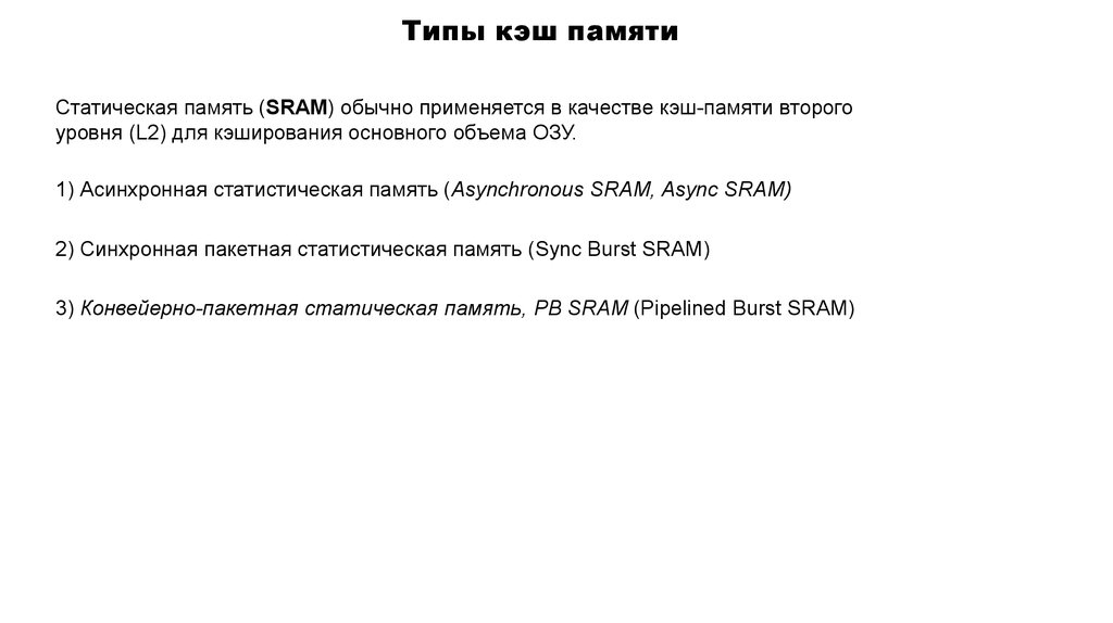 Типы кэш памятиСтатическая память (SRAM) обычно применяется в качестве кэш-памяти второго