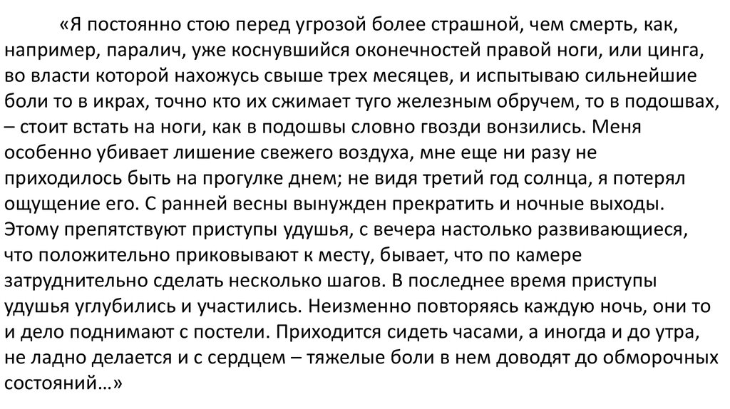 «Я постоянно стою перед угрозой более страшной, чем смерть, как,например, паралич, уже коснувшийся оконечностей правой ноги, или цинга,