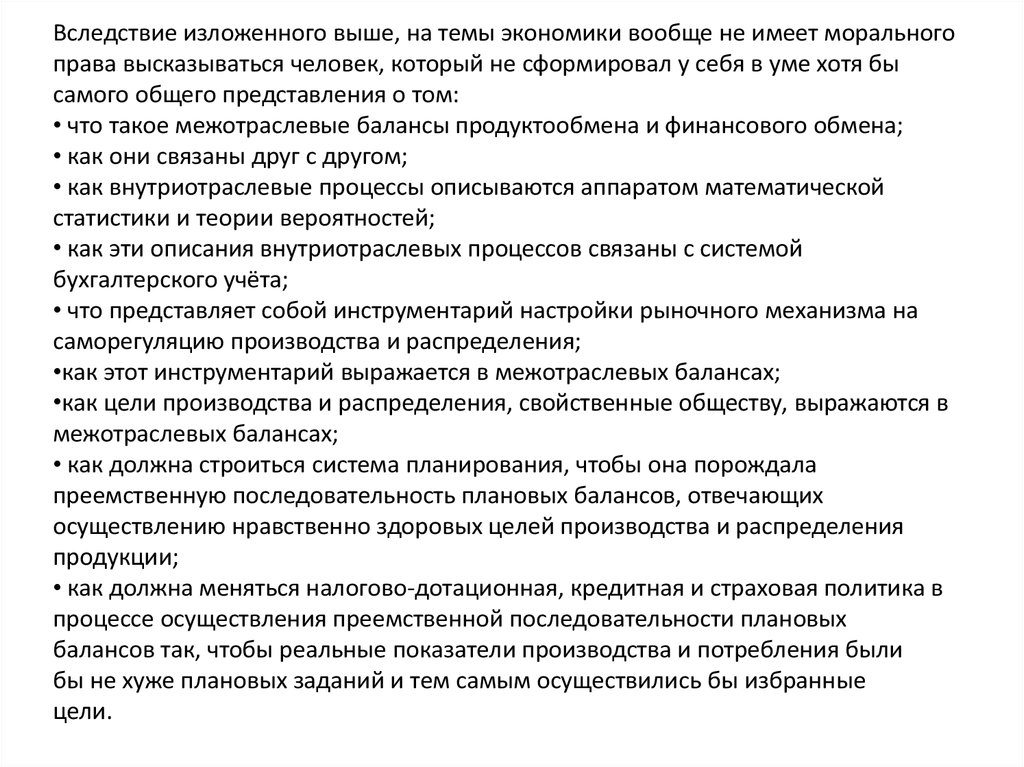 Вследствие изложенного выше, на темы экономики вообще не имеет моральногоправа высказываться человек, который не сформировал у себя в уме хотя бы