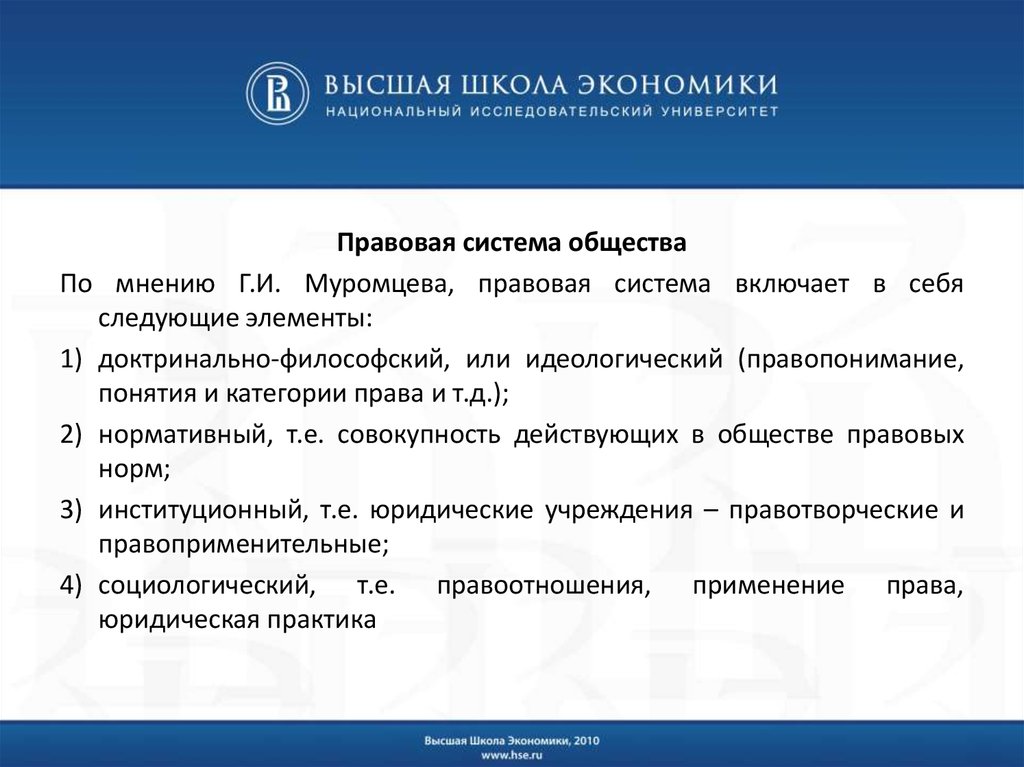 Правовая система обществаПо мнению Г.И. Муромцева, правовая система включает в себя