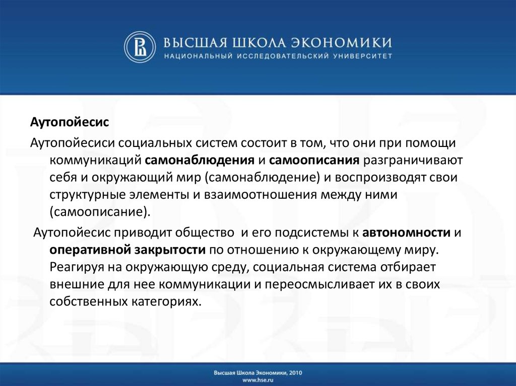 АутопойесисАутопойесиси социальных систем состоит в том, что они при помощи
