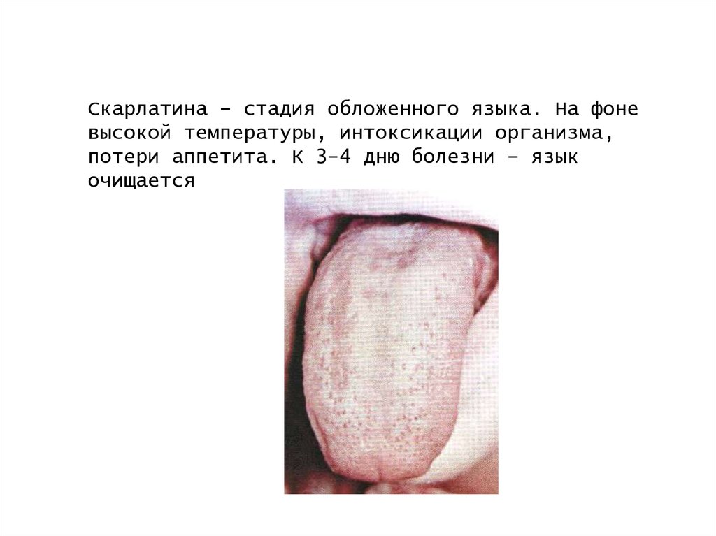 Скарлатина – стадия обложенного языка. На фоневысокой температуры, интоксикации организма,
