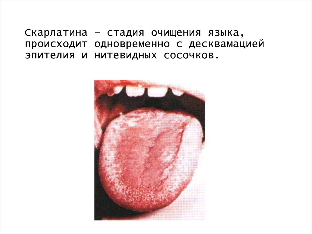 Скарлатина – стадия очищения языка,происходит одновременно с десквамацией