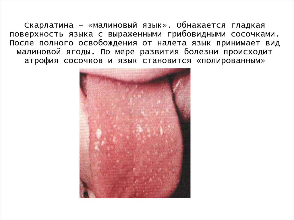 Скарлатина – «малиновый язык». Обнажается гладкаяповерхность языка с выраженными грибовидными сосочками.