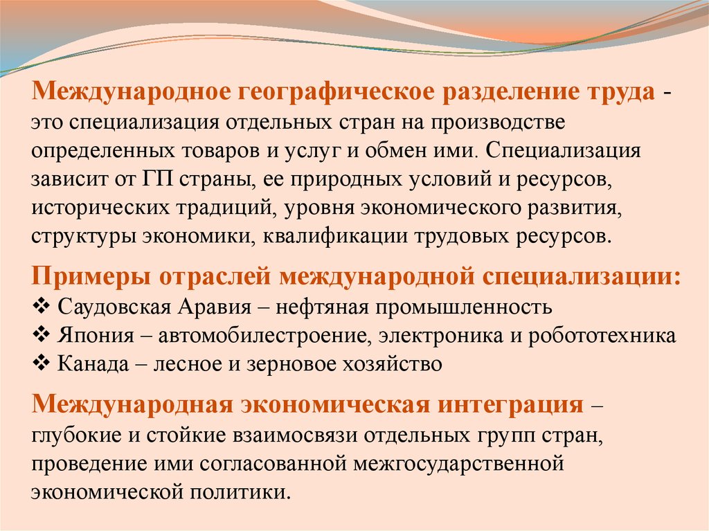 Международное географическое разделение труда это специализация отдельных стран на производствеопределенных товаров и услуг и обмен ими. Специализация