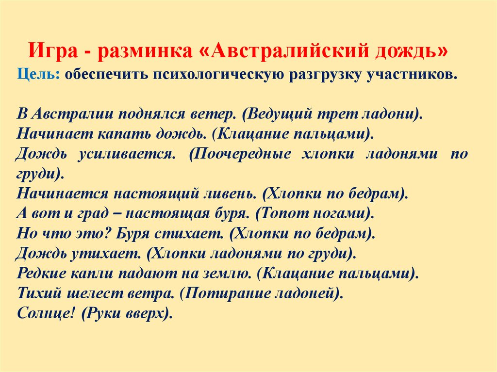 Игра - разминка «Австралийский дождь»Цель: обеспечить психологическую разгрузку участников.