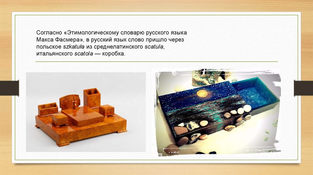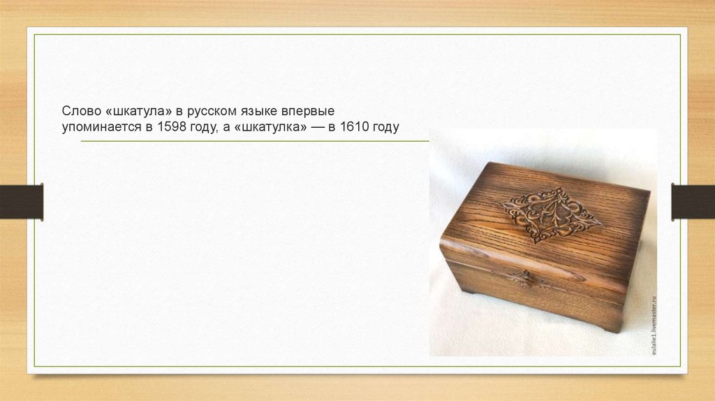 Слово «шкатула» в русском языке впервыеупоминается в 1598 году, а «шкатулка» — в 1610 году
