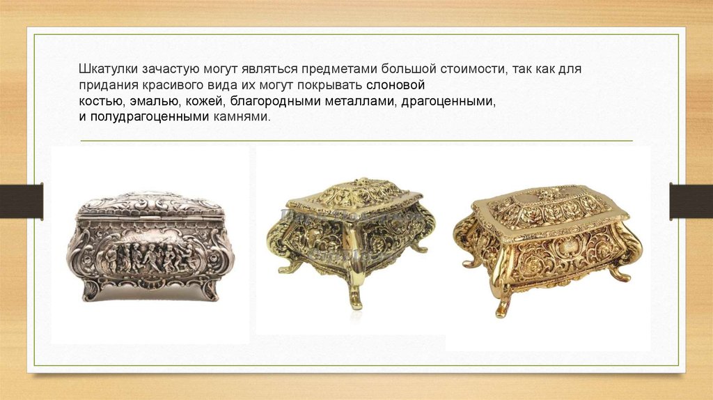 Шкатулки зачастую могут являться предметами большой стоимости, так как дляпридания красивого вида их могут покрывать слоновой