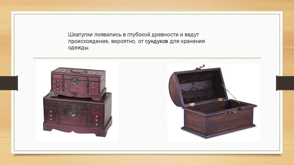 Шкатулки появились в глубокой древности и ведутпроисхождение, вероятно, от сундуков для хранения