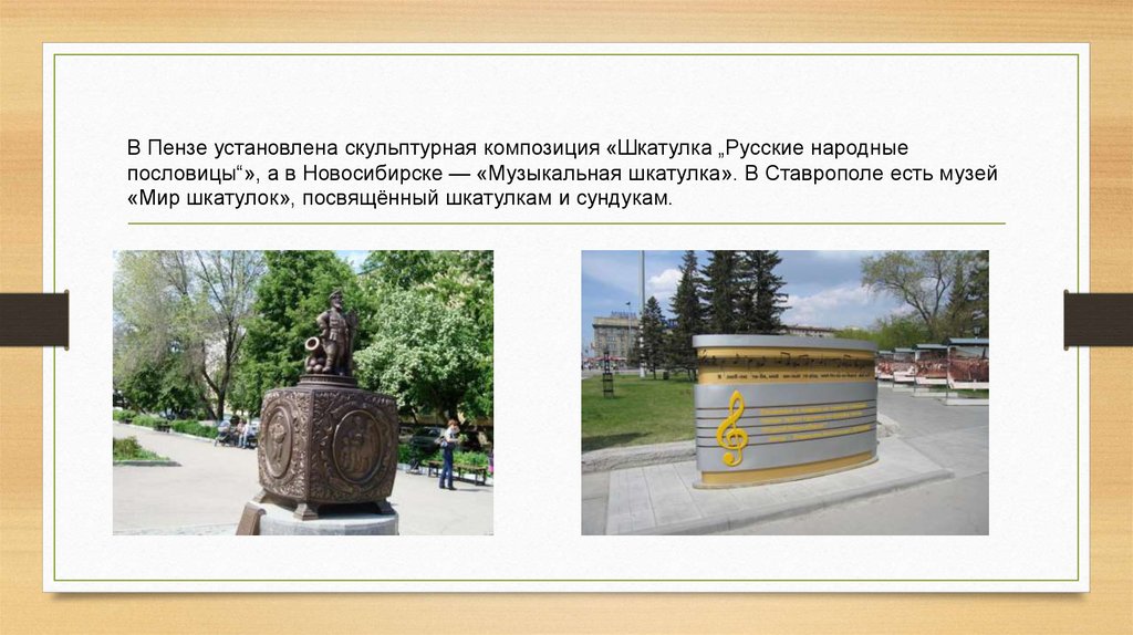 В Пензе установлена скульптурная композиция «Шкатулка „Русские народныепословицы“», а в Новосибирске — «Музыкальная шкатулка». В Ставрополе есть музей