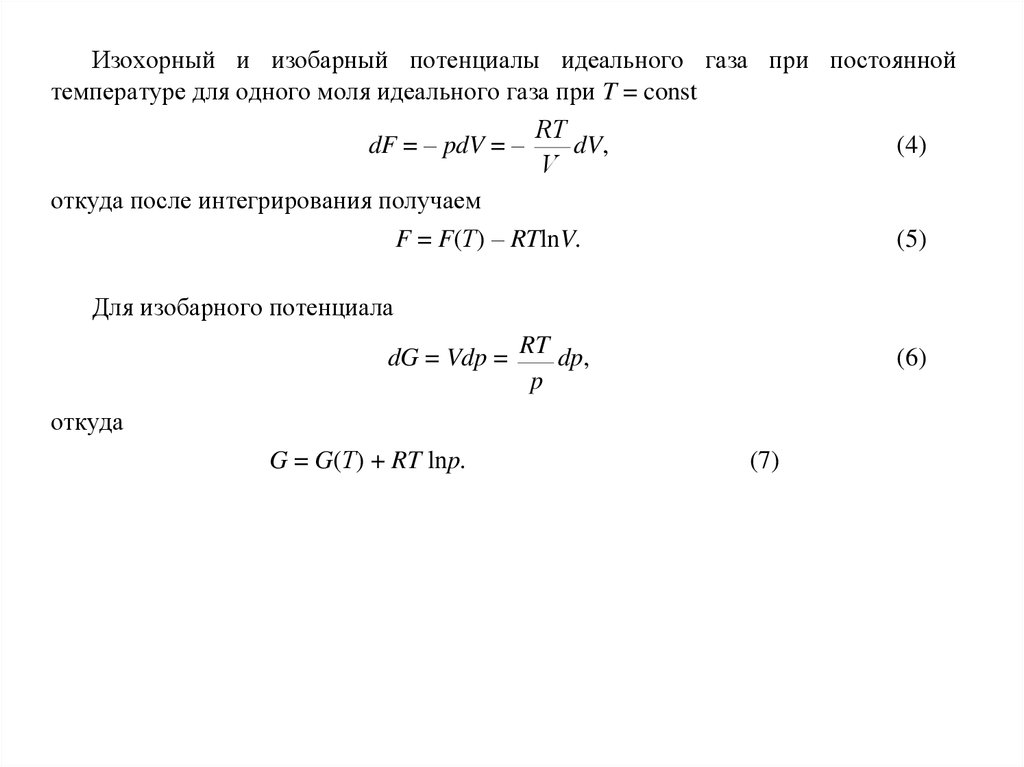 Изохорный и изобарный потенциалы идеального газа при постояннойтемпературе для одного моля идеального газа при T = const