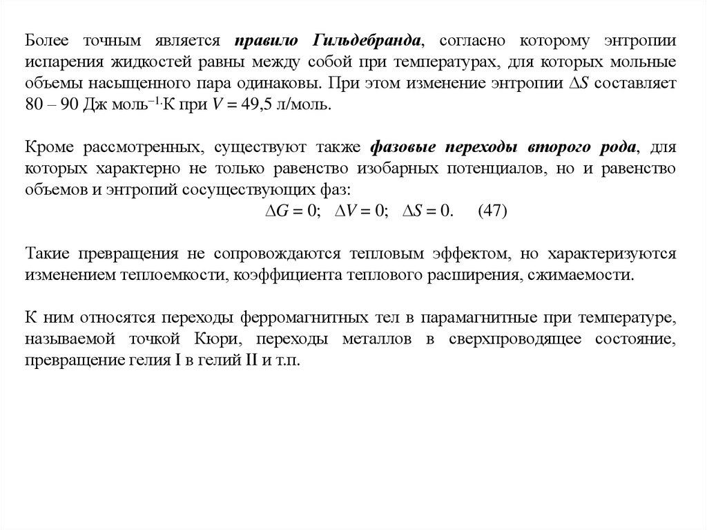 Более точным является правило Гильдебранда, согласно которому энтропиииспарения жидкостей равны между собой при температурах, для которых мольные