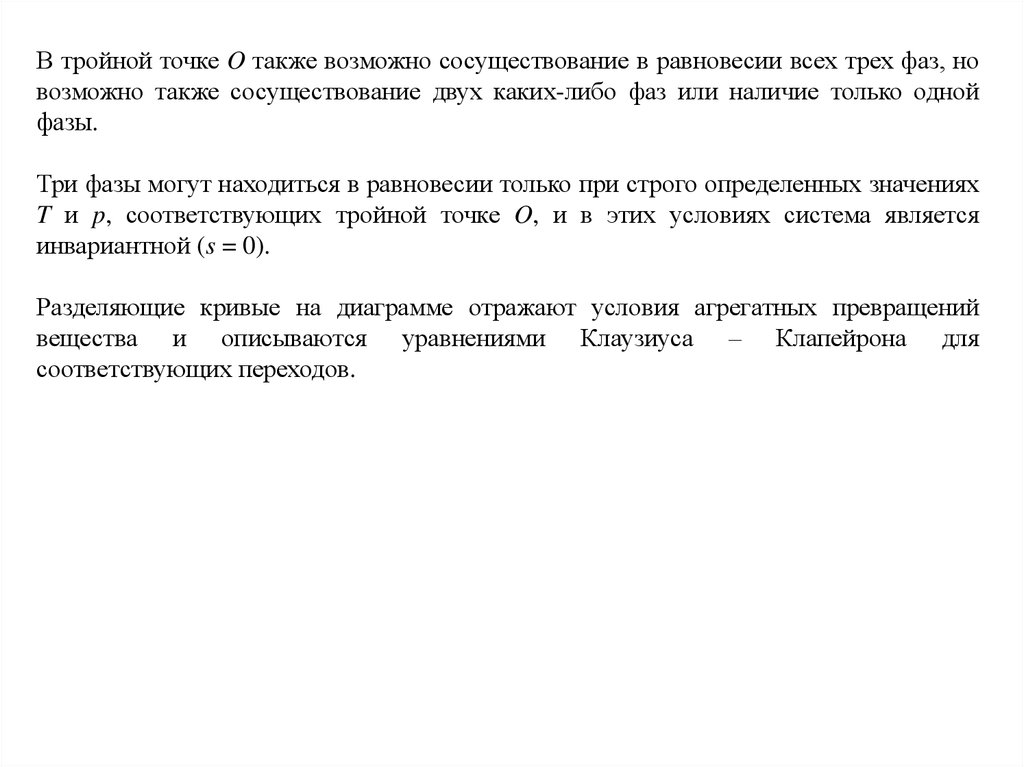 В тройной точке O также возможно сосуществование в равновесии всех трех фаз, новозможно также сосуществование двух каких-либо фаз или наличие только одной