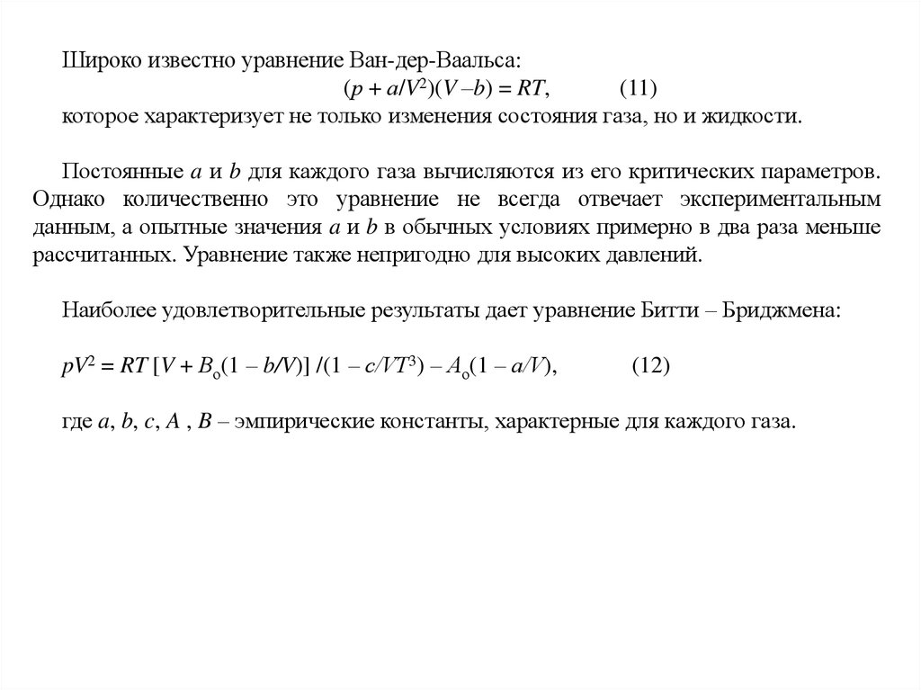 Наиболее удовлетворительные результаты дает уравнение Битти – Бриджмена:
