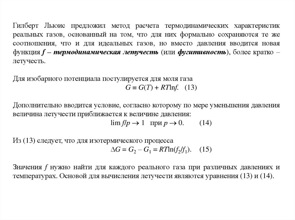 Гилберт Льюис предложил метод расчета термодинамических характеристикреальных газов, основанный на том, что для них формально сохраняются те же