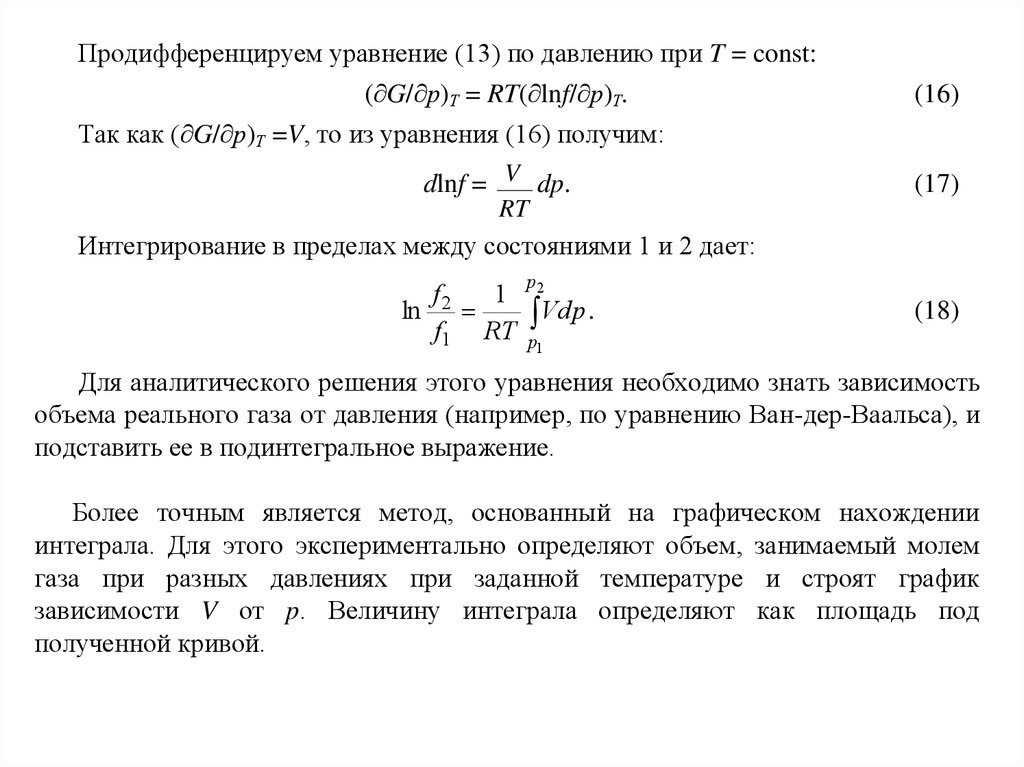 Продифференцируем уравнение (13) по давлению при T = const:( G/ р)Т = RT( lnf/ р)Т.