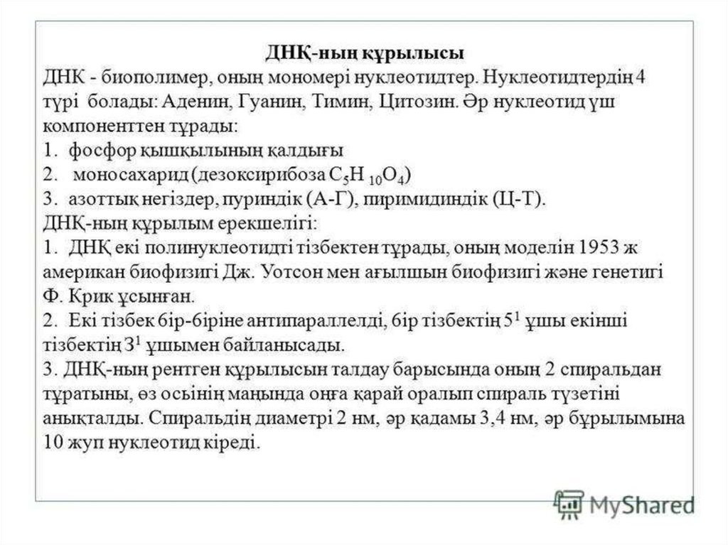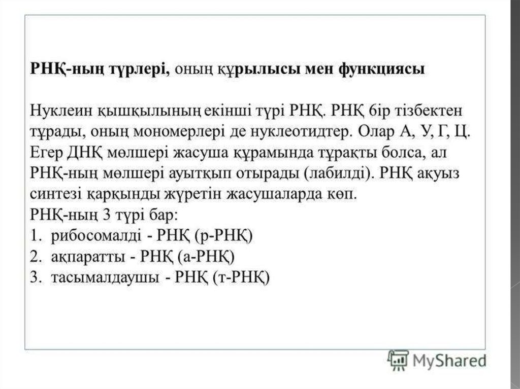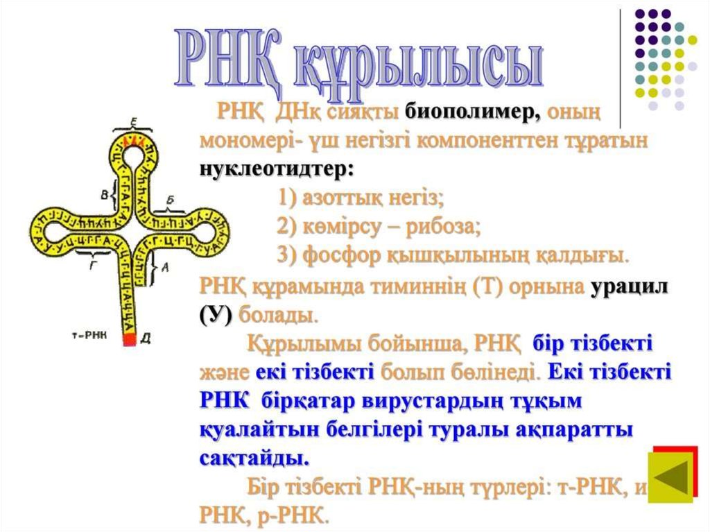 РНҚ құрылысы және физико-химиялық құрамы және олардың тұқымқуалаушылық ақпаратты іске асырудағы мәні