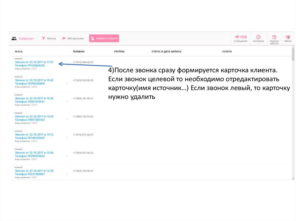 4)После звонка сразу формируется карточка клиента.Если звонок целевой то необходимо отредактировать