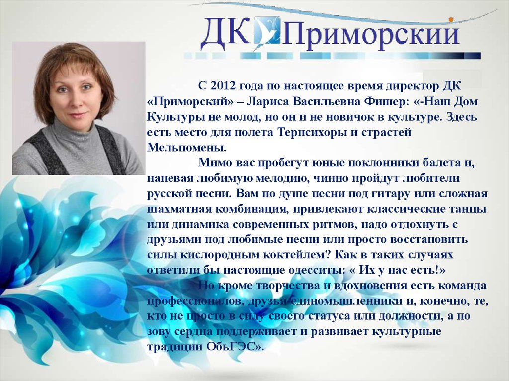 С 2012 года по настоящее время директор ДК«Приморский» – Лариса Васильевна Фишер: «-Наш Дом