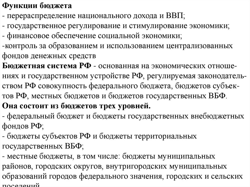 Бюджетная система РФ - основанная на экономических отношениях и государственном устройстве РФ, регулируемая законодательством РФ совокупность федерального бюджета, бюджетов субъектов РФ, местных бюджетов и бюджетов государственных ВБФ.