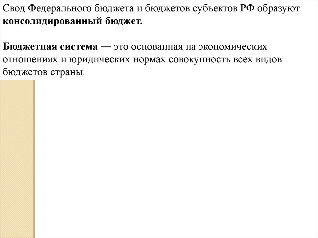 Свод Федерального бюджета и бюджетов субъектов РФ образуютконсолидированный бюджет.