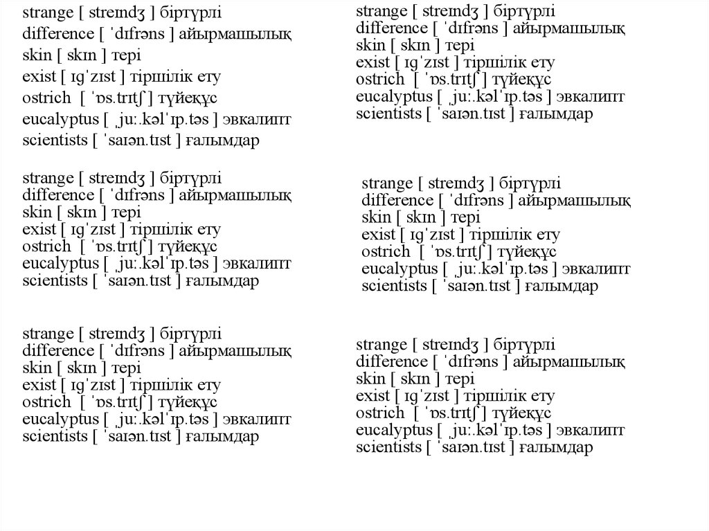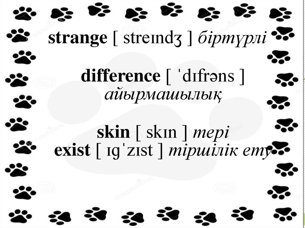 1. strange [ streɪndʒ ] біртүрлі difference [ ˈdɪfrəns ] айырмашылық skin [ skɪn ] тері exist [ ɪɡˈzɪst ] тіршілік ету ostrich [