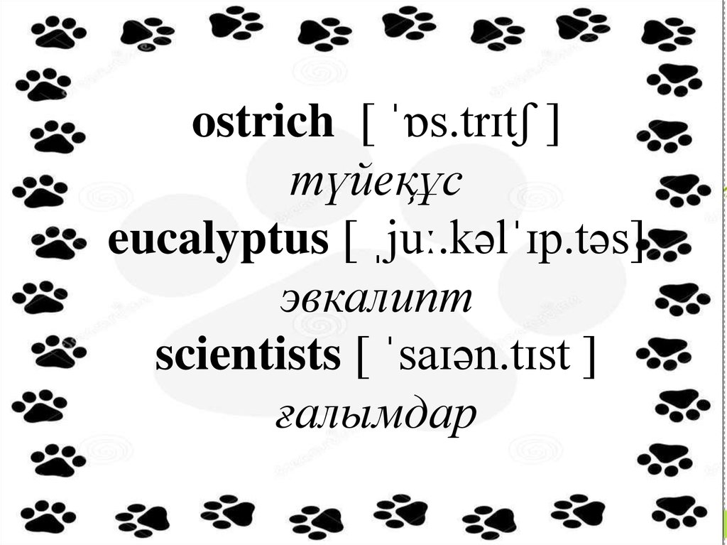 ˈɒs.trɪtʃ ] түйеқұсeucalyptus [ ˌjuː.kəlˈɪp.təs ] эвкалипт