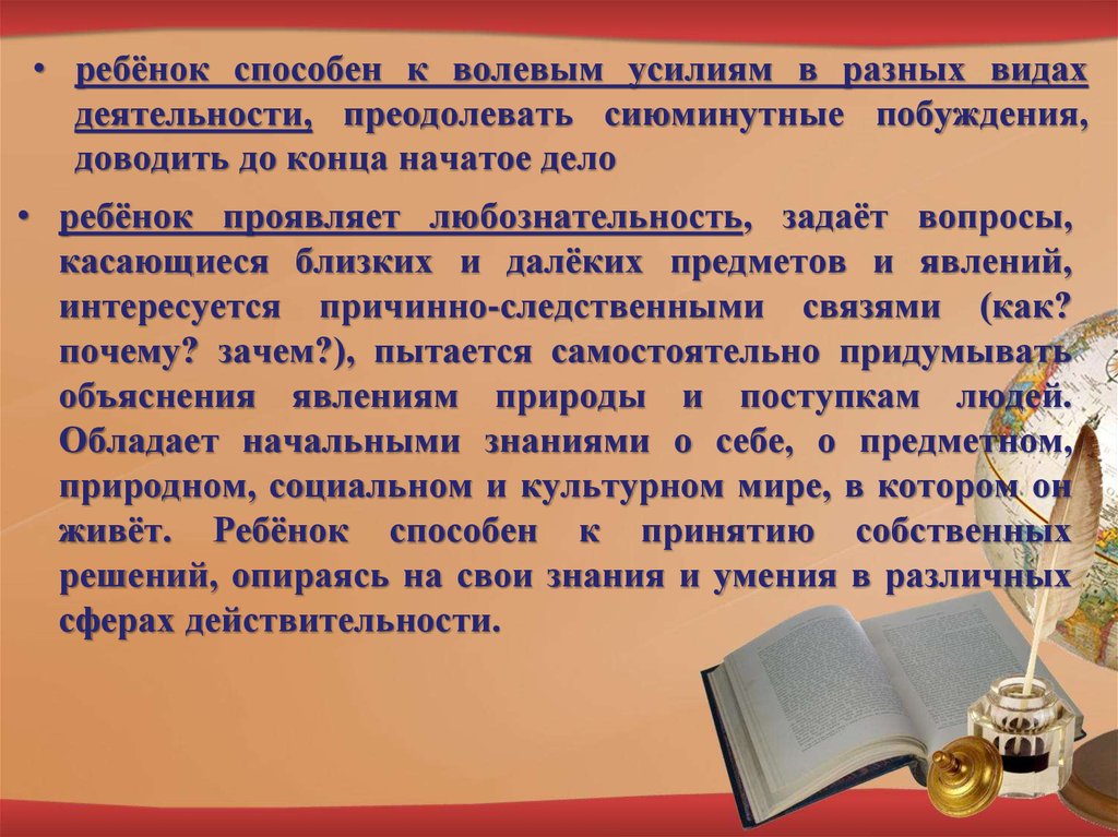 • ребёнок способен к волевым усилиям в разных видахдеятельности, преодолевать сиюминутные побуждения,