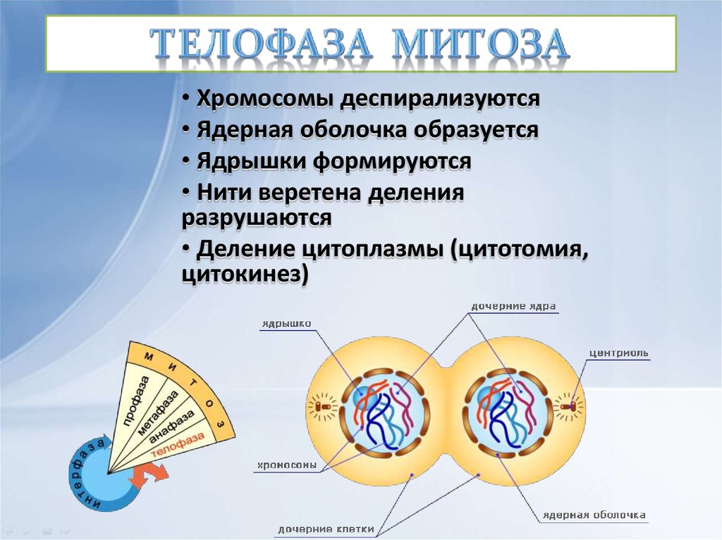 • Хромосомы деспирализуются• Ядерная оболочка образуется
