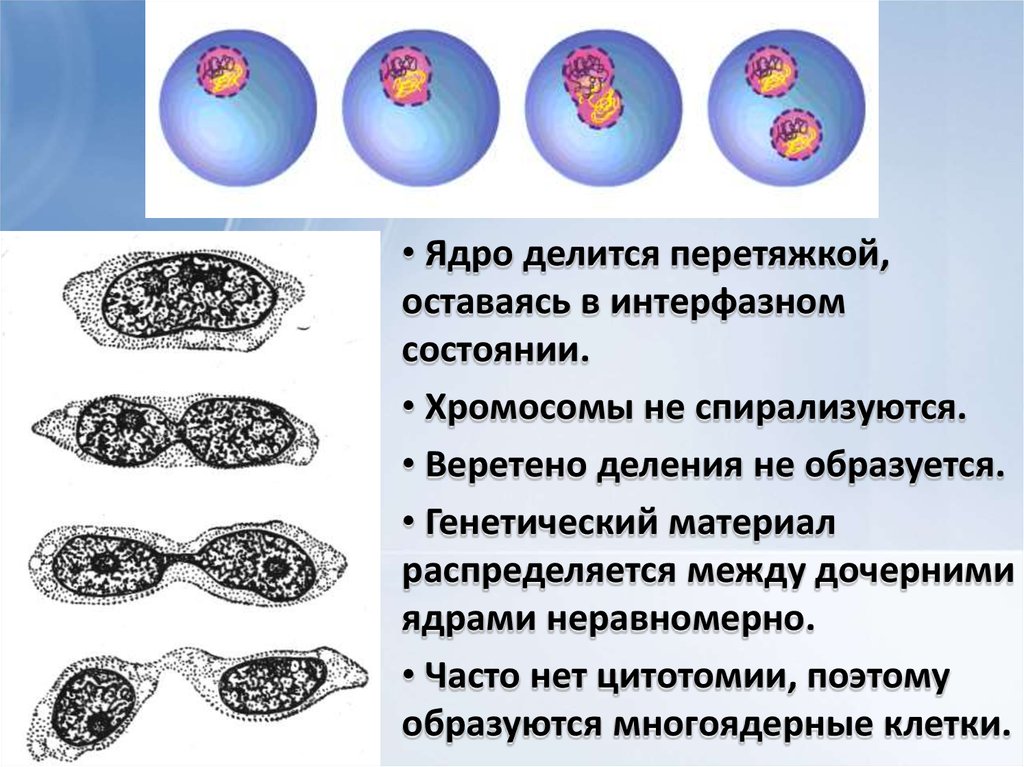 • Ядро делится перетяжкой,оставаясь в интерфазном