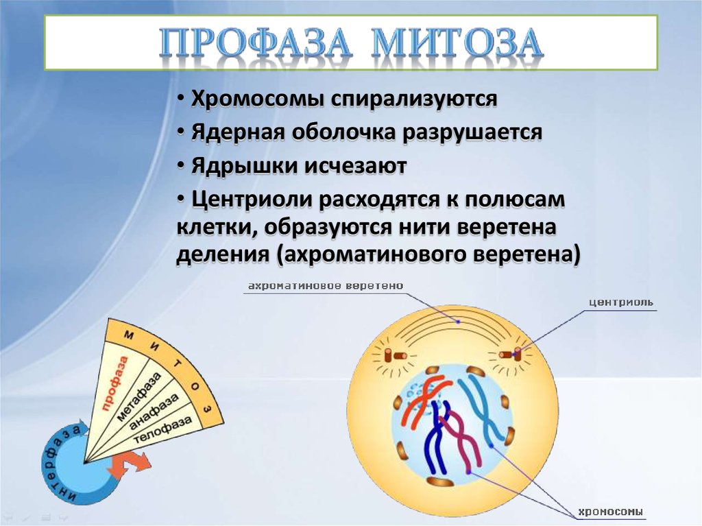 • Хромосомы спирализуются• Ядерная оболочка разрушается