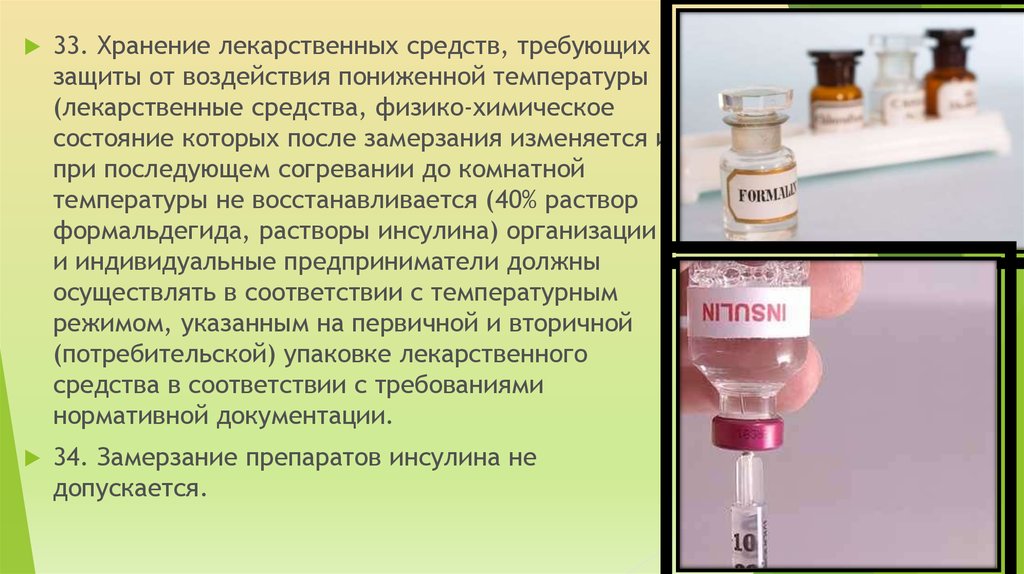 33. Хранение лекарственных средств, требующихзащиты от воздействия пониженной температуры