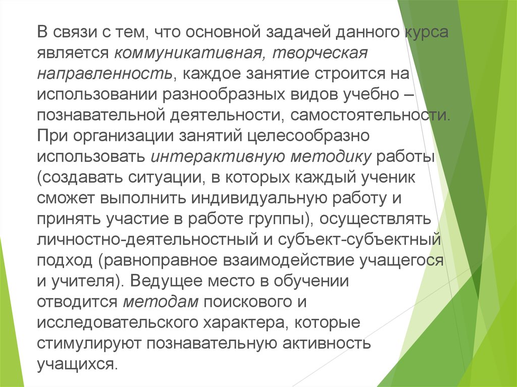 В связи с тем, что основной задачей данного курсаявляется коммуникативная, творческая
