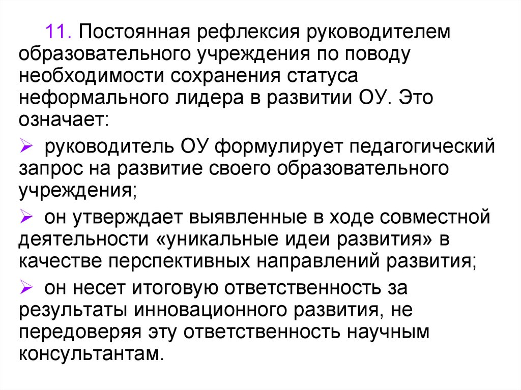 11. Постоянная рефлексия руководителемобразовательного учреждения по поводу