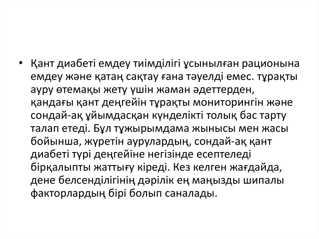 • Қант диабеті емдеу тиімділігі ұсынылған рационынаемдеу және қатаң сақтау ғана тәуелді емес. тұрақты