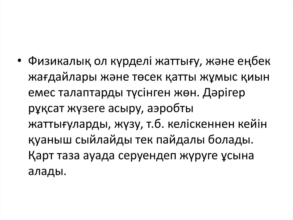 • Физикалық ол күрделі жаттығу, және еңбекжағдайлары және төсек қатты жұмыс қиын