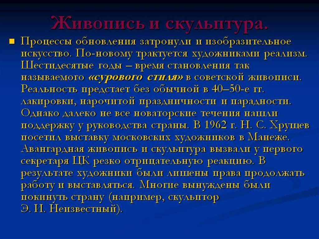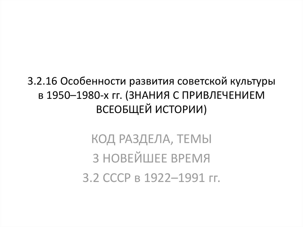1. 3.2.16 Особенности развития советской культуры в 1950–1980-х гг. (ЗНАНИЯ С ПРИВЛЕЧЕНИЕМ ВСЕОБЩЕЙ ИСТОРИИ)