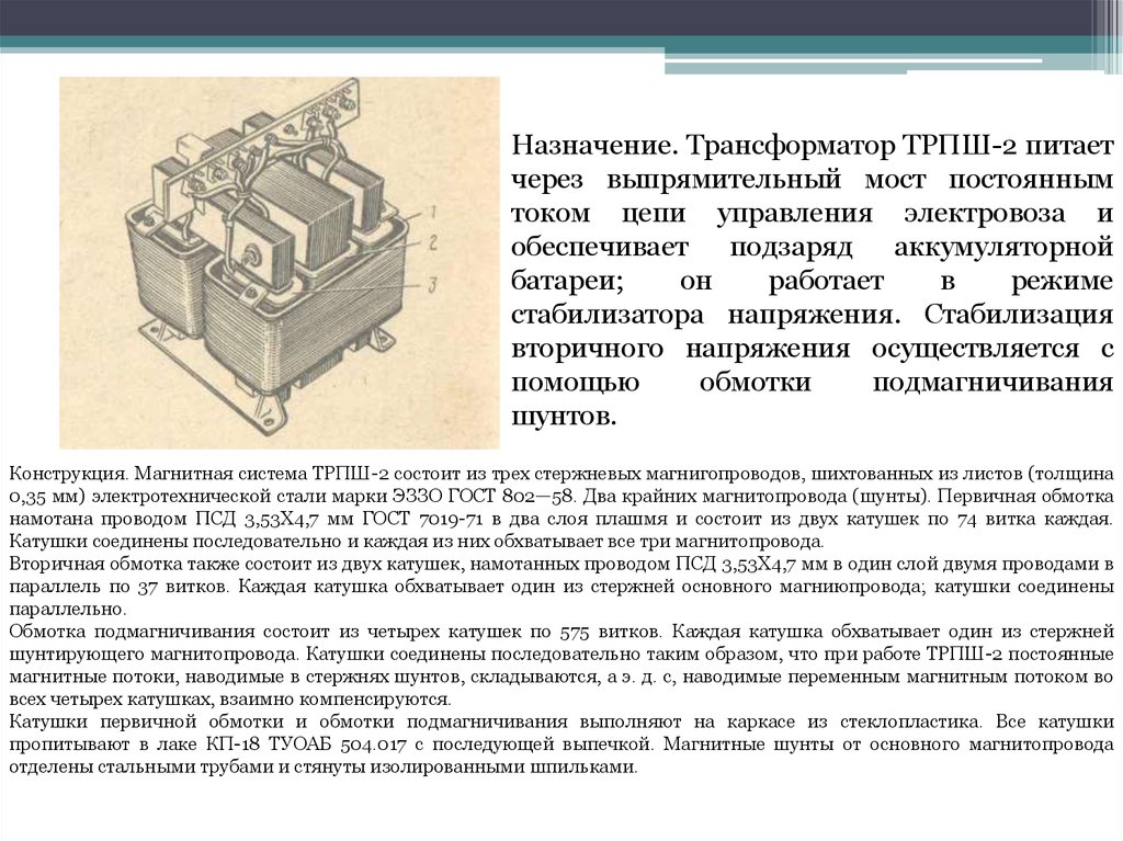 Назначение. Трансформатор ТРПШ-2 питаетчерез выпрямительный мост постоянным