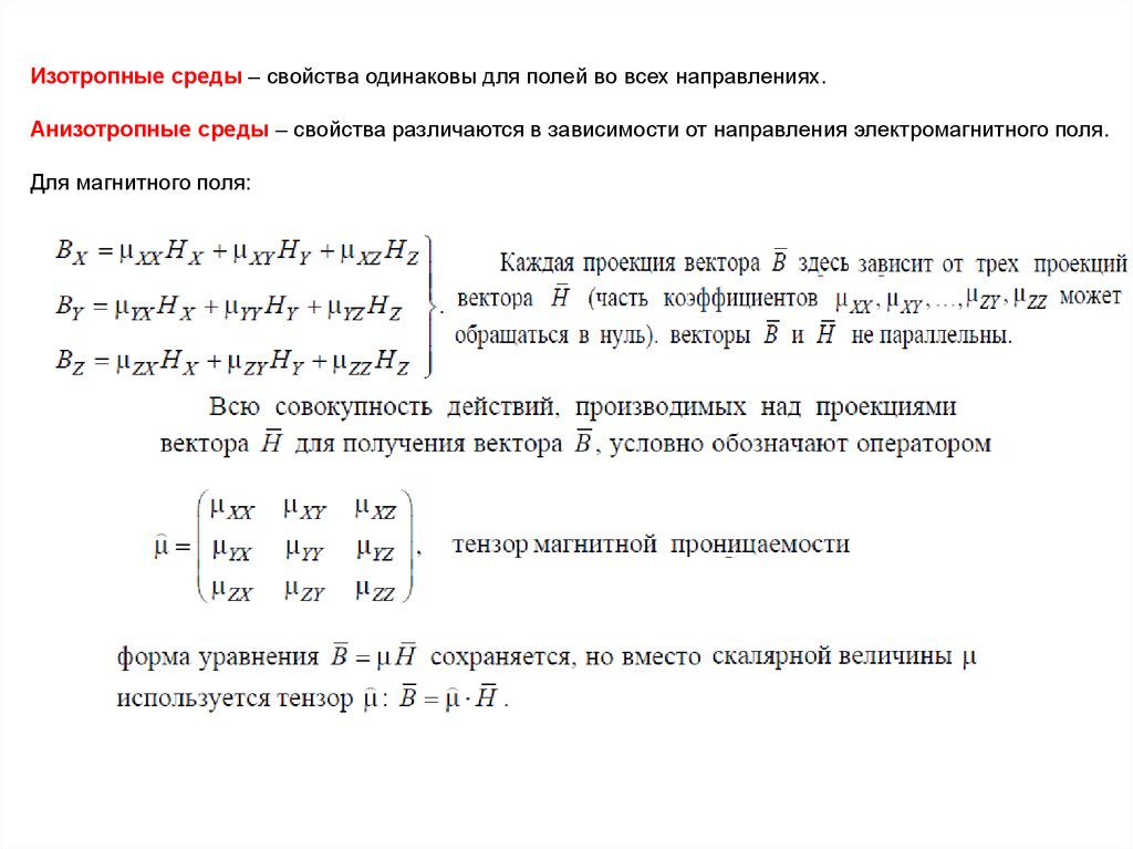 Изотропные среды – свойства одинаковы для полей во всех направлениях.Анизотропные среды – свойства различаются в зависимости от направления электромагнитного поля.