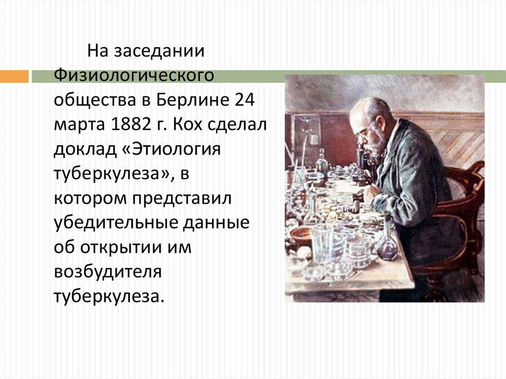В 1882 г. германский бактериолог Роберт Кохоткрыл возбудителя туберкулеза, которого назвали
