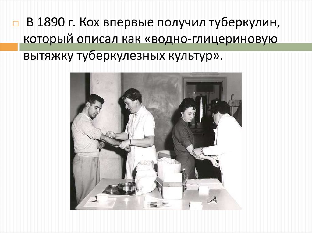 В 1890 г. Кох впервые получил туберкулин,который описал как «водно-глицериновую